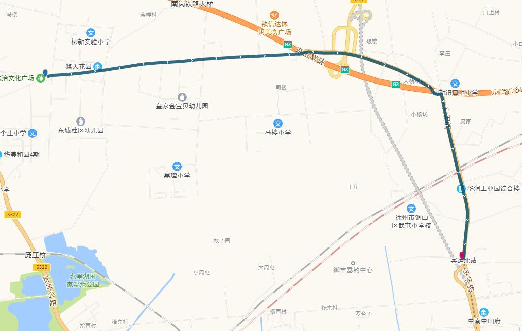 線路站點:山南小鎮(zhèn),山水龍瑞,馬場湖路口,馬場湖,怡康花園,后勤學院北,誠坤鋼材市場,蘇堤北路立交橋(西),蘇堤北路立交橋(東),蘇堤路小學,永業(yè)花園小區(qū),江蘇四監(jiān),銅沛路東口,中山北路立交橋