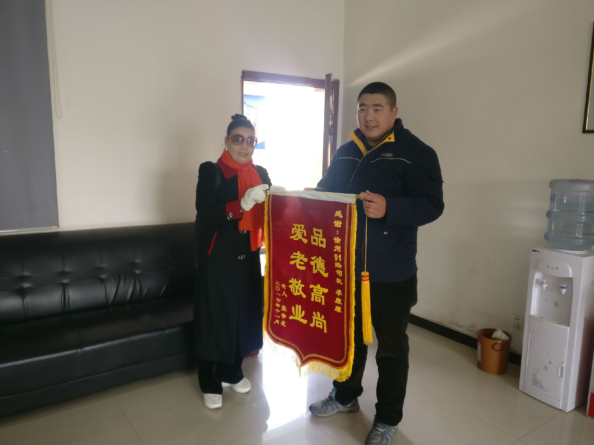 11月21日,李康康正執(zhí)行末班車的任務(wù),夜晚寒冷,車上乘客也比較少。即將到達終點站時,車上僅剩一位年近70的張女士,李康康看她神情慌張地看著窗外。經(jīng)詢問,得知張女士剛搬到新城區(qū)住不久,迷路了??紤]到張女士年齡較大,于是就把想送張女士回家的想法向線路長及公司做出了匯報。經(jīng)批準(zhǔn)后,他開車將張女士送回了家。事后,張女士為了表達謝意,給李康康送來一面錦旗。