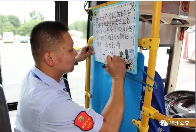 原來他已養(yǎng)成了習慣,在他的駕駛室后方掛著一塊白板,寫著乘車的溫馨提示語和天氣情況。每天他都會記錄下當天的天氣情況:“為了您的乘車安全,請不要隨意更換座位。感謝您的支持!2018年7月12日星期四,多云到晴,27~34攝氏度”,“特別是老年人、孩子,開車時換位子太危險了?!毖λ山忉尩?。